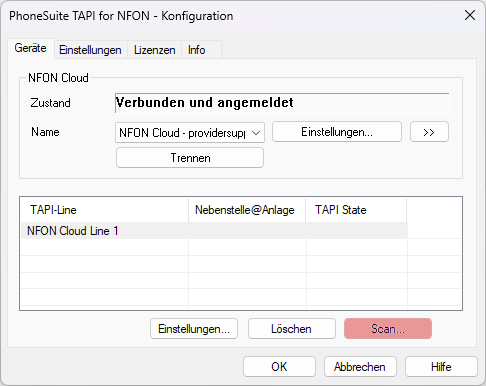 - Es werden die Nebenstellen der NFON-Anlage ausgelesen und können als TAPI-Lines übernommen werden.