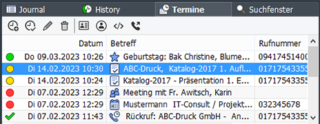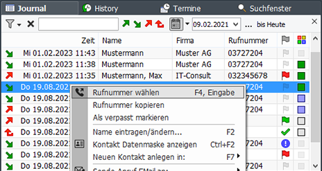 ![]() Anrufprotokollierung im RufjournalDas Journal dient der Protokollierung aller Anrufe u.a. mit Zeitpunkt, Name, Rufnummer und Gesprächsdauer. Dabei werden verpasste Anrufe hervorgehoben angezeigt. Einzelne Einträge können mit einem Status und einer Kategorie markiert werden. Die integrierte Suchfilterleiste ermöglicht das Filtern der Journaleinträge nach Name, Rufnummer, Zeitraum und Rufzuständen (eingehend, ausgehend, verbunden und verpasst).