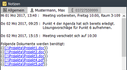 Per Interworking Steuer-Sequenz lassen sich Anwendungen, Scripte, Dokumente und URLs sowohl automatisch bei einem Anruf, als auch manuell per Menü oder Hotkey aufrufen. Die Rufnummer oder beliebige Datenbankfelder werden dabei mittels Platzhalter-Variablen als Parameter im Dateipfad oder in der URL übergeben. Eine weitere Option ist die Steuerung anderer Anwendungen mit Hilfe von simulierten Tastatureingaben. So ist es zum Beispiel möglich, bei einem eingehenden Anruf automatisch ein Online-Telefonverzeichnis (wie "gelbeseiten.de") im Webbrowser zu öffnen oder die Rufnummer an eine laufende CRM-Anwendung zu übertragen. ![]() Termine und AufgabenOrganisieren Sie Ihre persönlichen Termine, Aufgaben und Anruferinnerungen mit dem integrierten Terminmanager. Geburtstagserinnerungen werden anhand Ihrer Kontaktdaten automatisch angezeigt. Ein "Termin-Alarm" informiert Sie rechtzeitig über alle fälligen Termine. TeamChatTeamChat bietet eine einfache und schnelle 1:1 Kommunikation mit den per CTI Server-Kurzwahlpanel verbundenen Kollegen. So lassen sich Chat-Nachrichten auch dann austauschen, wenn Sie gerade ein Telefongespräch führen. Oder senden Sie einem Kollege, dessen Präsenzstatus auf "Abwesend" steht, eine Nachricht mit der Bitte um Rückruf. TeamChat unterstützt mehrere parallele Chats auf jeweils separaten Tabs. Notizen![]() Das Fenster "Notizen" dient der Erstellung von kontakt- oder rufnummerbezogenen Notizen. Um bereits vorhandene Notizen zu öffnen, genügt es, den entsprechenden Kontakt oder die Rufnummer im Telefonbuch oder Rufjournal zu markieren. Bei einem Anruf werden alle zugehörigen Notizen automatisch angezeigt. Notizen ohne Bezug zu einem Kontakt oder einer Rufnummer können im Tab "Allgemein" eingetragen werden. Der Editor unterstützt das Einfügen von Texten und Hyperlinks per Drag&Drop. Gemeinsame Notizen für Gruppenarbeit:Speichern Sie Ihre Notizen in einer zentralen Datenbank oder einem gemeinsamen Netzwerkverzeichnis, um diese mit Ihren Kollegen zu teilen.