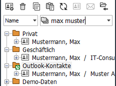 In den Ordnern wird immer der Inhalt der Spalten angezeigt, die als Namensspalten markiert sind. Meist sind das Name und Vorname. Falls kein Name oder Vorname eingetragen ist, wird der Firmenname angezeigt, auch wenn die Spalte mit Firmenname nicht als Namensspalte markiert wurde.Die dritte Ebene zeigt alle Rufnummern zum jeweiligen Datensatz an, wenn mehr als eine eingetragen ist. Enthält der Datensatz nur eine Rufnummer, wird diese neben dem Telefon angezeigt, sobald der Datensatz selektiert wurde.