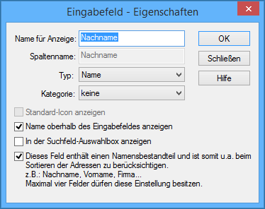 Name, Vorname, Firma: Diese Spalten sind normalerweise zusätzlich als Namensspalten zu kennzeichnen und werden somit stellvertretend für den Datensatz angezeigt.