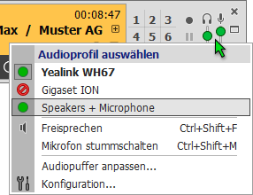 Die manuelle Auswahl eines Audioprofiles erfolgt im PhoneDialog über das Audioregler-Kontextmenü oder im Dialog [Optionen > Audio] über die Schaltfläche "Als aktives Profil festlegen".