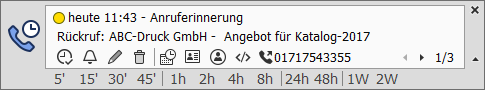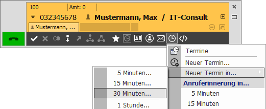 Termin-Menü des PhoneDialogs können Sie einen Termin mit relativer Zeitvorgabe setzen, z.B. "Neuer Termin in:" 30 Minuten, 1 Stunde, 24 Stunden, 1 Woche.