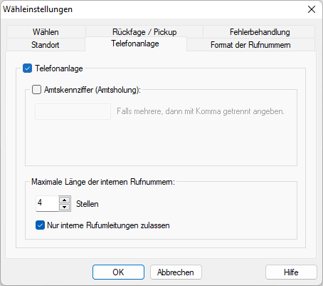 Sollte dort dennoch eine Amtsholung erforderlich sein, dann ist dem CTI Client über folgende Einstellungen mitzuteilen, dass ihm die Rufnummer mit Amtsholung übergeben wird.[Optionen > Telefonie > Erweiterte Einstellungen > Weitere Einstellungen]: