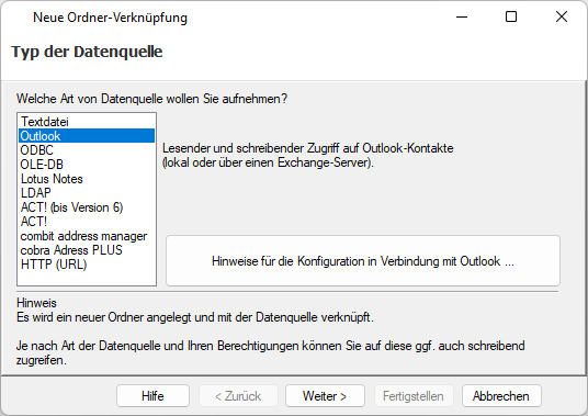 Telefonbuch > Neu > Neue Ordner-Verknüpfung > Outlook, ODBC, ....