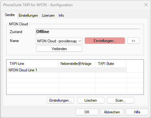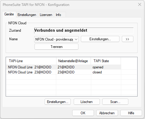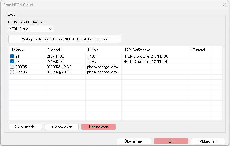 - Es werden die Nebenstellen der NFON-Anlage ausgelesen und können als TAPI-Lines übernommen werden.