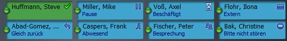 0=AVAILABLE bereit 1=LOGGEDOUT logged out from CTI Sever; vom Server abgemeldet 2=AWAY away; abwesend 3=BRB Be Right Back; Bin gleich zurück 4=PAUSE Pause (Essen,Kaffee, ...) 5=BUSY busy; beschäftigt 6=MEETING in a meeting; in einer Besprechung 7=OFFWORK not ready to work (vacation, sick...); nicht Arbeitsbereit (Urlaub,Krank...) 8=EXTWORK out of the house (field service, business trip ...); außer Haus (Außendienst,Dienstreise...) 9=DND DoNotDisturb; bitte nicht stören 10=HOLIDAY Holiday; Urlaub 11=MSG Other Status with Message Kommentare: